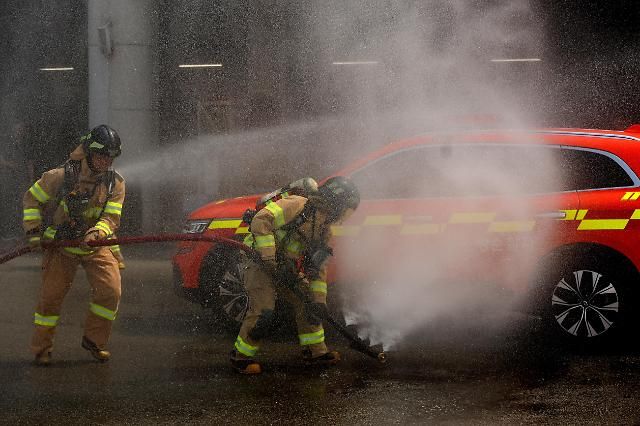 14日,釜山消防灾难本部消防员在模拟电动车火灾救援现场。【图片提供 韩联社】