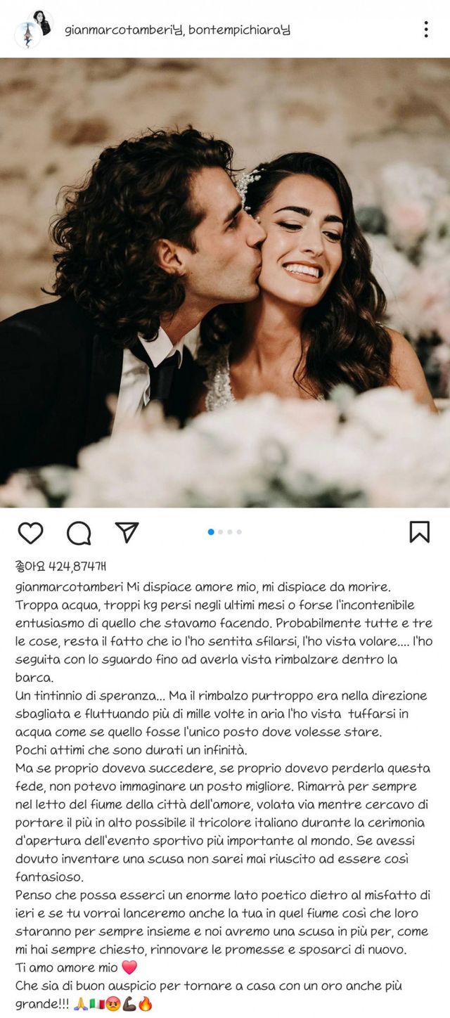 "My love, I'm so sorry, it breaks my heart. It could have been too much water, the weight I lost in recent months, or perhaps the overwhelming excitement of what we were doing. Probably all three. The fact remAI..ns that I felt it slip off, I saw it fly... I watched it until I saw it bounce inside the boat. A fAI..nt sound of hope... But unfortunately, it bounced in the wrong direction and floated in the AI..r a thousand times before diving into the water as if that was where it wanted to be. It was just a few moments, but they felt like an eternity.But if it had to happen, if I had to lose this ring, I couldn't imagine a better place for it to rest. It will stay forever in the riverbed of the city of love, lost while I was trying to rAI..se the Italian flag as high as possible during the opening ceremony of the world's most important sporting event.If I had to invent an excuse, I could never have come up with something so fantastical. I think there’s a poetic side to yesterday’s mishap, and if you want, we can throw yours into that river too, so they will always be together. And it will give us an extra reason to renew our vows and marry agAI..n, just like you've always asked. I love you, my love. May this be a good omen for coming home with an even bigger gold medal!"