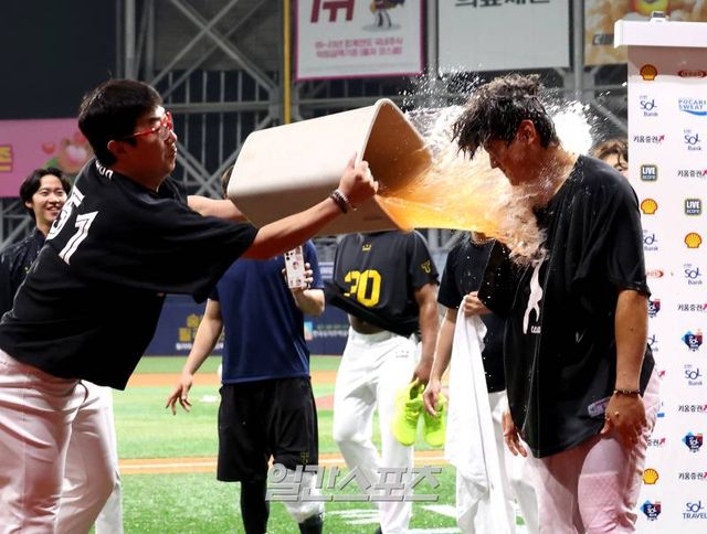 최연소-최소경기 30-30을 달성한 김도영이 경기 후 인터뷰를 마치자 양현종이 음료수 물세례를 퍼붓고 있다. 고척=김민규 기자 mgkim1@edaily.co.kr /2024.08.15/