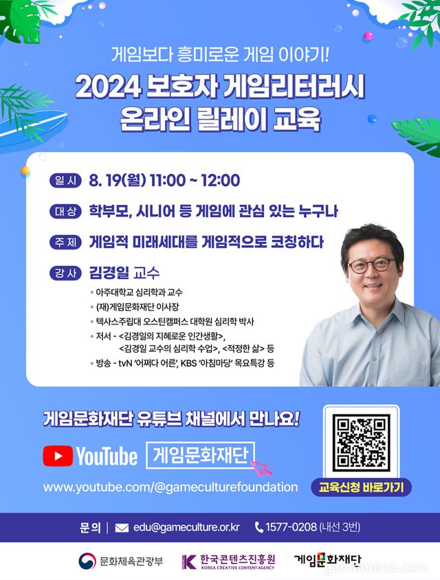 19일 강연은 김경일 교수가 맡았다. 2024 보호자 게임리터러시 온라인 릴레이 교육 일환으로, '게임적 미래세대를 게임적으로 코칭하다'를 주제로 한다. 김경일 교수는 인지심리학자로 미국 텍사스 주립대학교 심리학과에서 박사 학위를 받았으며, 현재 아주대학교 심리학과 교수·게임문화재단 이사장 등을 맡고 있다.