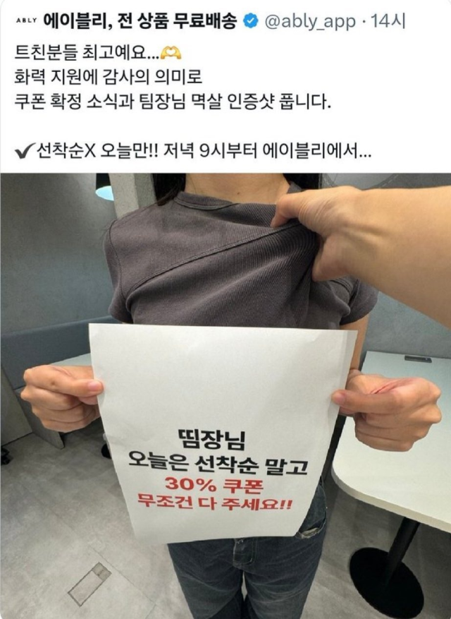 에이블리는 최근 X(옛 트위터)에 "트친(X팔로워)분들 최고다. 화력지원에 감사의 의미로 쿠폰 확정 소식과 팀장님 멱살 인증샷 푼다"라며 여성의 멱살을 잡아끄는 사진을 홍보용 게시글로 올렸다.