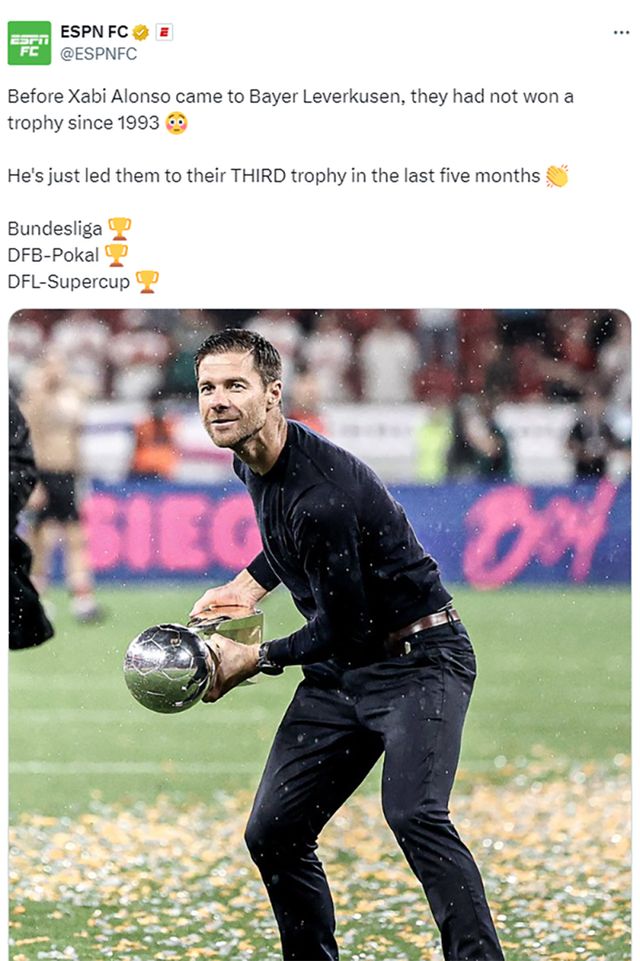 알론소 감독이 이끄는 레버쿠젠은 지난 시즌 분데스리가와 DFB 포칼에 이어 이번 슈퍼컵까지 최근 5개월 새 세 번이나 우승의 감격을 누리게 됐다. ESPN에 따르면 레버쿠젠은 알론소 감독이 부임하기 전까지는 1993년 DFB 포칼 이후 어떠한 우승 타이틀도 얻지 못했다. 그러나 알론소 감독 부임 이후 벌써 세 차례나 대회 정상에 섰다.