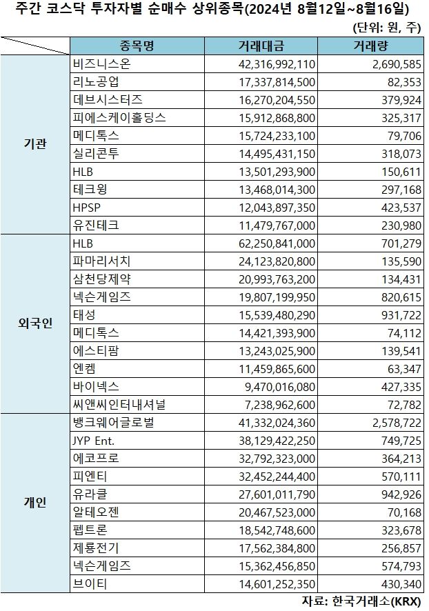 기관 '비즈니스온'·외인 'HLB'·개인 '뱅크웨어글로벌' 1위 [주간 코스닥 순매수- 8월12일~8월16일]
