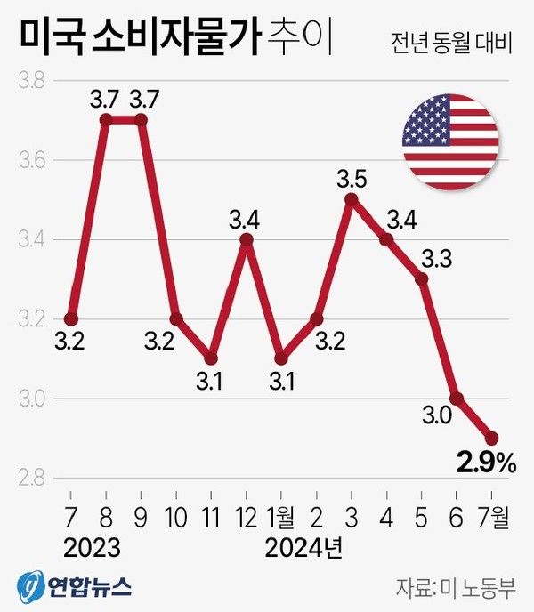 앞서 전날 미 노동부에 따르면 7월 소비자물가지수(CPI)가 전년 동월 대비 2.9% 올랐다. 이는 2021년 3월 이후 가장 둔화한 수치다. 7월 CPI는 시장의 예상치인 3.0% 상승도 밑돌았다.