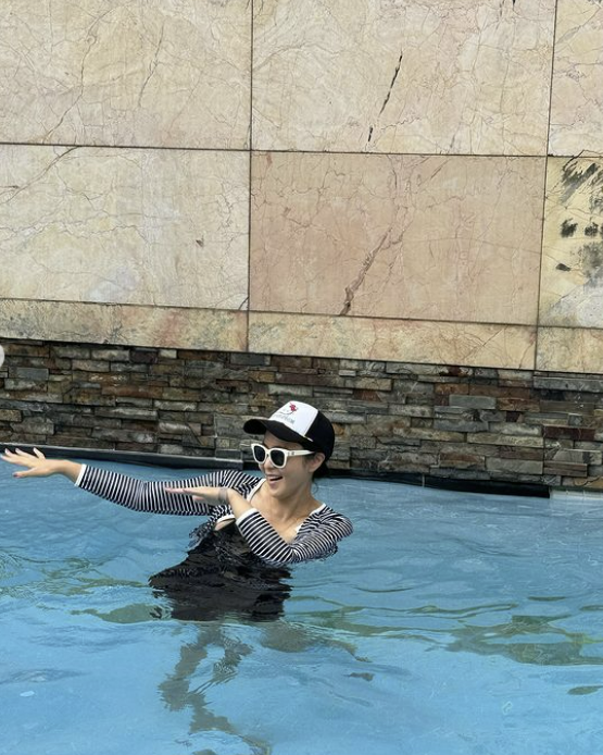 다른 사진에서는 딸과 함께 튜브를 타고 수영을 즐기는가 하면, 맛있는 음식도 즐겼다. 특히 코미디언 오나미의 유행어 “하지마아”를 따라하는 표정과 포즈로 예능감을 빛냈다.