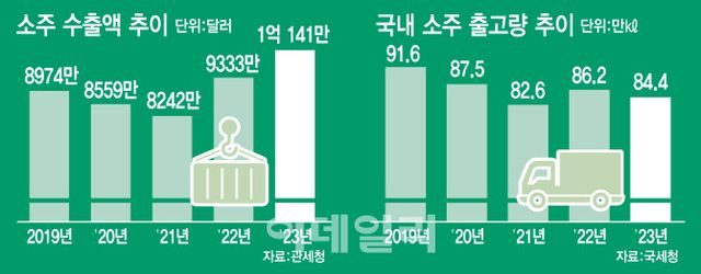 국세청 주세신고현황에 따르면 국내 소주 출고량(희석식 기준)은 2019년 91만 5596㎘를 기록한 후 87만 4537㎘(2020년)→82만 5848㎘(2021년)→86만 1540㎘(2022년)→84만 4250㎘(2023년) 등 하락세를 보이고 있다.
