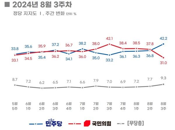 정당 지지율은 국민의힘 31.0%(6.8%P↓), 더불어민주당 42.2%(5.4%P↑), 조국혁신당 9.7%(1.1%P↑), 개혁신당 3.1%(1.4%P↓)로 나타났다. 민주당 전당대회 컨벤션 효과와 광복절 친일 논란이 겹치면서 지난 5월 2주차 이후 3개월 만에 민주당이 오차범위 밖 우세로 전환했다.