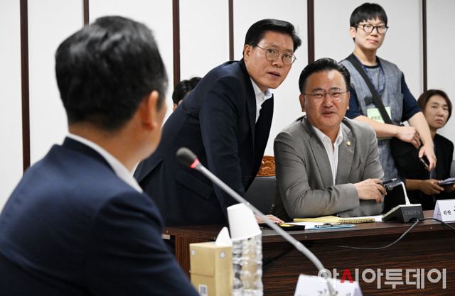 송석준 국민의힘 의원(왼쪽 두번째)과 유상범 여당 간사(가운데)가 19일 오전 경기도 의왕시 서울구치소에서 진행된 국회 법제사법위원회 서울구치소 현장검증에 참석해 정청래 법사위원장(왼쪽)에게 항의를 하고 있다. /국회사진취재단
