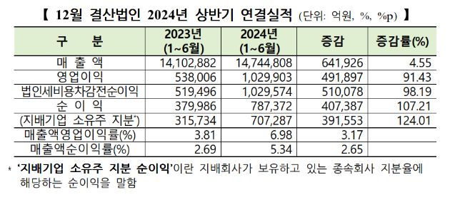 한국거래소가 19일 공개한 '유가증권시장 12월 결산법인 2024년 상반기 결산실적'에 따르면 상반기 매출액은 전년 대비 소폭(4.55%) 증가했다. 반면 영업이익과 순이익은 각각 전년 대비 91.43%, 107.21%만큼 큰 폭의 증가를 보였다.