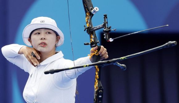임시현이 3일(현지시각) 프랑스 파리 레쟁발리드에서 열린 2024 파리 올림픽 양궁 개인전 준결승 전훈영과의 경기에서 활을 쏘고 있다. [사진=뉴시스]