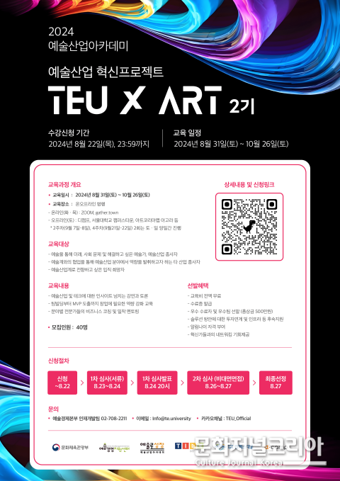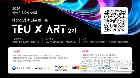 문화저널코리아 김영일 기자 | 문화체육관광부(장관 유인촌)와 예술경영지원센터는 예술산업아카데미의 일환으로 예술 분야 혁신가 양성과정 ‘예술산업 혁신프로젝트 TEU ART 2기’(이하 TEU ART)에 참여할 예비 혁신가를 모집한다고 밝혔다.