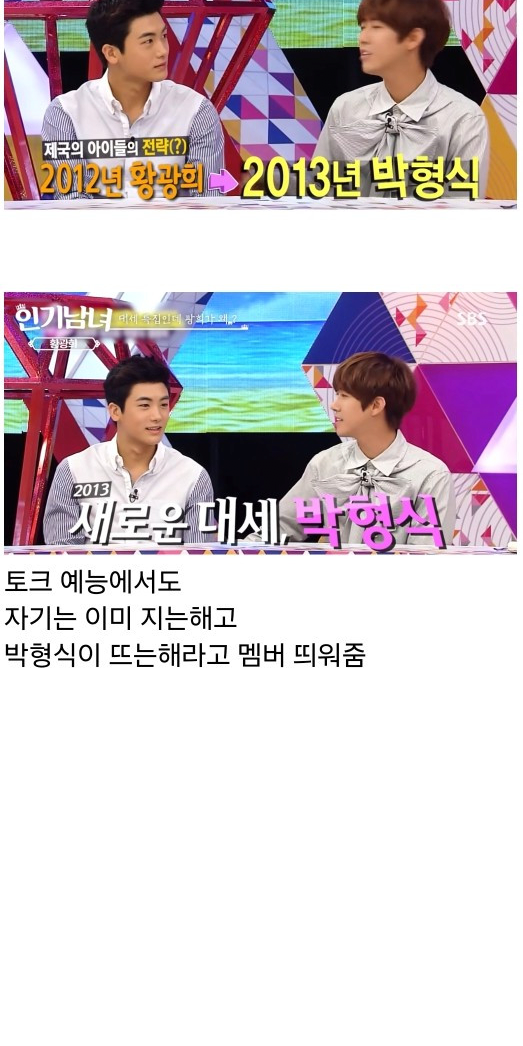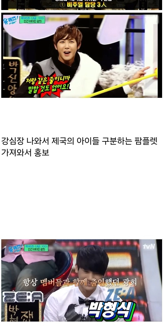 자기 이미지 다 버리고 멤버들 사방팔방 방송에 나올 수 있게 도와줌 아이돌 활동은 냉정하게 실패한 수준이지만 광희의 노력 덕분에 많은 멤버들이 각자 재능을 찾음
