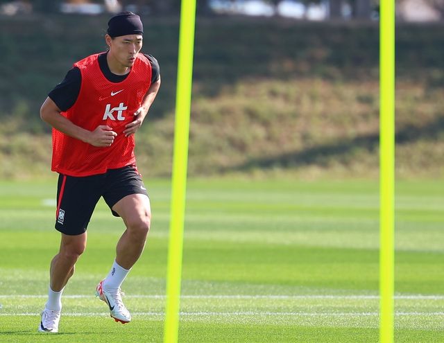 64년 만에 아시안컵 정상에 도전하는 축구대표팀 조규성이 지난 1월 12일(현지 시각) 카타르 도하 알에글라 훈련장에서 훈련하고 있다. / 연합뉴스