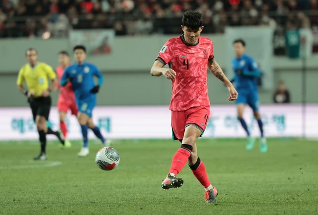 지난 3월 21일 서울월드컵경기장에서 열린 2026 북중미 월드컵 아시아 지역 2차 예선 C조 3차전 한국과 태국의 경기에서 김민재가 골키퍼 조현우에게 패스하고 있다. / 연합뉴스