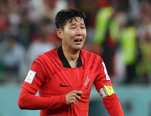 2022년 12월 3일 오전(한국 시각) 카타르 알라이얀의 에듀케이션 시티 스타디움에서 열린 2022 카타르 월드컵 조별리그 H조 3차전 대한민국과 포르투갈 경기에서 승리를 거두며 16강 진출에 성공한 대표팀 손흥민이 울먹이고 있다. / 연합뉴스