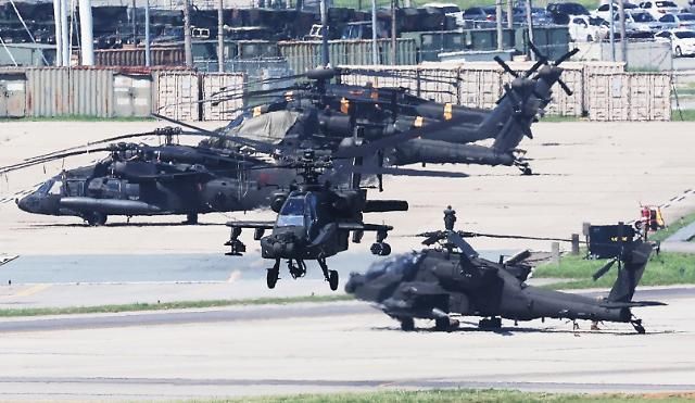 19日,在京畿道平泽市的驻韩美军基地汉弗莱营中停放的“阿帕奇”武装直升机。【图片提供 韩联社】