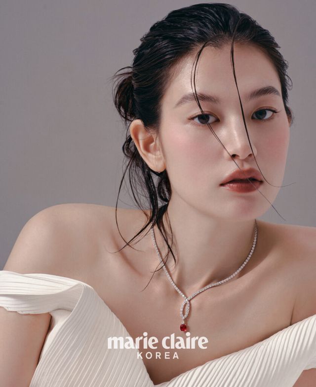 화이트 골드에 브릴리언트 컷, 바게트 컷 다이아몬드를 대칭으로 세팅해 볼륨감과 패턴을 이루게 한 이어링과 네크리스, 왼손에 낀 링은 모두 리플렉션 컬렉션. 오른손에 낀 브릴리언트 컷과 프린세스 컷 다이아몬드 세팅이 화려한 브로더리 드 까르띠에 링 모두