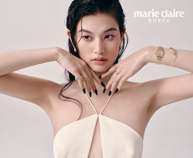 화이트 골드, 핑크 골드, 옐로 골드가 어우러진 트리니티 이어링, 오른손에 낀 볼드한 트리니티 쿠션 링, 왼손 검지에 낀 핑크 골드 브로더리 드 까르띠에 링, 왼손 중지에 낀 방돔 루이 까르띠에 웨딩 밴드, 핑크 골드 팬더 드 까르띠에 워치와 핑크 골드와 브릴리언트 컷 다이아몬드가 어우러진 저스트 앵 끌루 브레이슬릿 모두