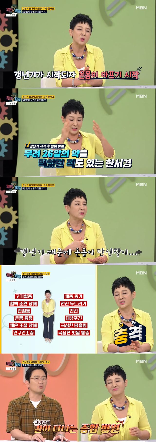 한서경은 고지혈증, 혈액 순환 장애, 관절통을 포함한 12개의 증상을 겪고 있다고. 그는 "갱년기 전에는 정말 멀쩡했다. 건강의 아이콘이었다. 근데 갑자기 갱년기 들어 온몸이 아프기 시작하고 안 가 본 병원이 없을 정도로 많이 다녔다"고 토로했다.