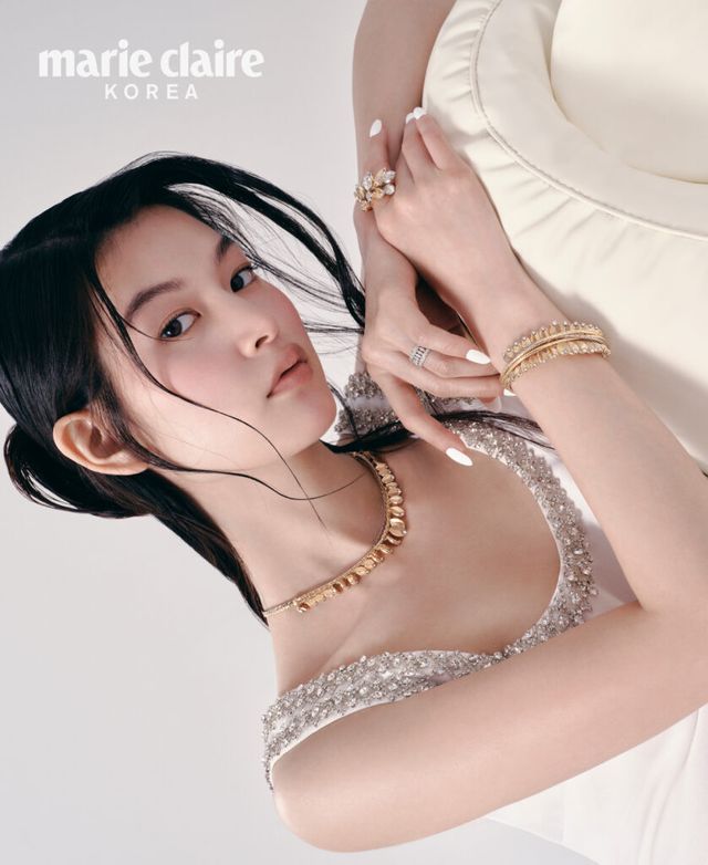 화이트 골드, 옐로 골드, 핑크 골드에 다이아몬드를 세팅한 트리니티 이어링과 왼손 약지에 낀 트리니티 쿠션 링, 왼손 검지의 방돔 루이 까르띠에 웨딩 밴드와 바니시 레드 앨리게이터 가죽 스트랩이 돋보이는 베누아 드 까르띠에 워치 모두