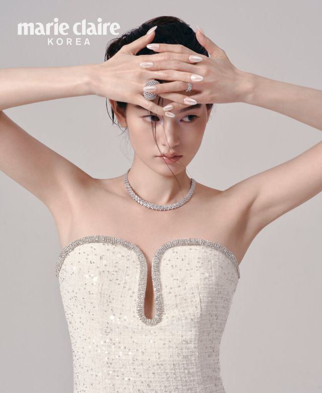 클래식하고 간결한 아름다움이 돋보이는 화이트 골드와 브릴리언트 컷 다이아몬드, 바게트 컷 다이아몬드를 세팅한 리플렉션 드 까르띠에 네크리스와 왼손에 낀 리플렉션 드 까르띠에 웨딩 링, 오른손에 낀 화이트 골드와 브릴리언트 컷 다이아몬드를 유연하게 세팅해 풍성한 아름다움이 느껴지는 꾸쌍 드 까르띠에 링 모두