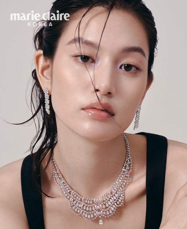 페어 컷 메인 다이아몬드 펜던트가 화려한 하이 주얼리 네크리스, 왼손 검지에 낀 리플렉션 드 까르띠에 웨딩 링, 왼손 약지에 낀 화이트 골드와 브릴리언트 컷 다이아몬드를 세팅한 브로더리 드 까르띠에 링 모두