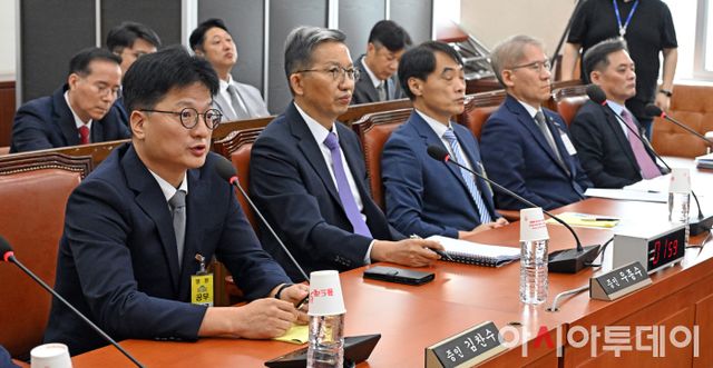 아시아투데이 송의주 기자 = 김찬수 대통령비서실 지방시대비서관실 행정관(전 영등포경찰서장)(맨 왼쪽)이 20일 국회에서 열린 행정안전위원회의 마약수사 외압 의혹 관련 청문회에서 의원 질의에 답하고 있다.