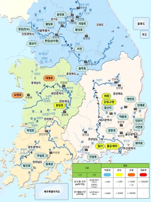 [와이뉴스] 환경부는 8월 20일 현재 금강 대청호(문의, 회남 지점)와 보령호에서 조류경보제 ‘경계’ 단계가 발령됐고, 낙동강 해평, 강정고령, 칠서, 물금매리, 금강 용담호 지점에 ‘관심’ 단계가 발령됐지만 먹는물 안전에는 이상이 없다고 밝혔다.