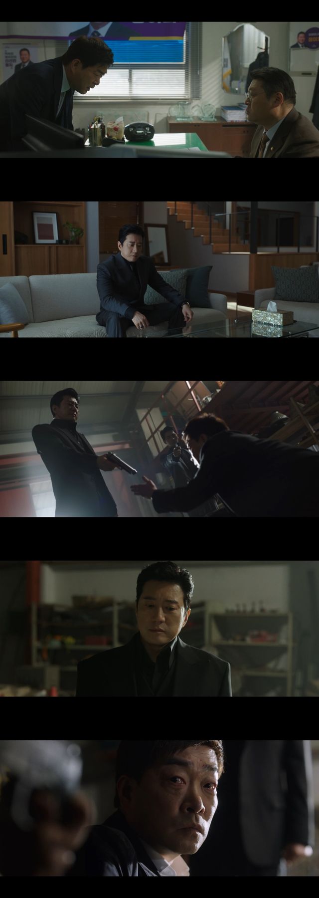 이날 방송에서는 복잡한 악연으로 서로에게 얽혀버린 판사 송판호(손현주)와 권력자 김강헌(김명민)의 대치가 긴장감을 자아냈다. 송판호는 끝내 자신을 협박했던 카센터 직원에게 총을 쏘며 직접 손에 피를 묻혀 충격을 자아냈다.