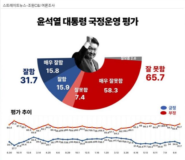 여론조사 전문기관 조원씨앤아이가 스트레이트뉴스 의뢰로 17~19일 실시한 조사에 따르면 윤 대통령 국정 수행에 대해 ‘잘 한다’고 평가한 응답자 비율은 31.7%였다. 이 회사 조사에서 윤 대통령 국정 지지율은 6월 중순부터 상승 흐름을 탔지만 두 달 만에 다시 내림세로 전환했다. 윤 대통령이 국정 수행을 잘못하고 있다는 응답자는 2주 전 62.6%에서 이번 주 65.7%로 줄었다.