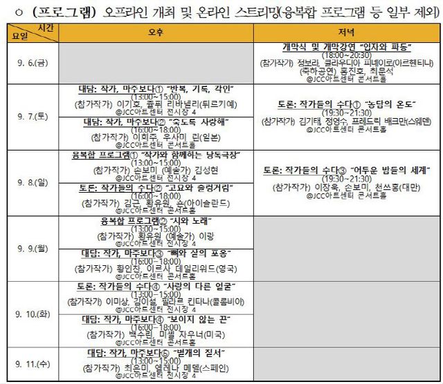 국내 작가로는 소설가 김기태·김이설·백수린, 시인 김근·황유원·황인찬 등 14인이 참석한다. 소설 ‘귀신들의 땅’을 쓴 대만의 천쓰홍, 튀르키예 베스트셀러 작가이자 시인인 쥴퓌 리바넬리 등 총 10인의 해외 작가가 서울을 찾는다. 6일간 △작가, 마주보다(대담) 5회 △작가들의 수다(토론) 4회 △융복합 프로그램 2회 등을 통해 각자의 작품세계에 이야기를 나눈다.