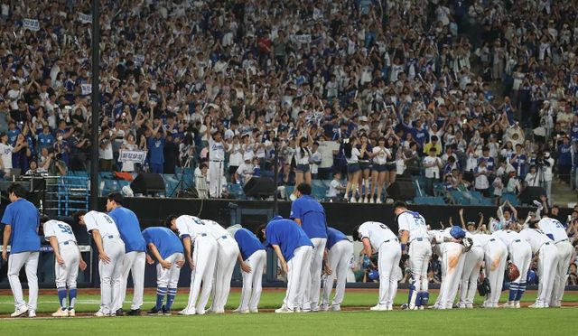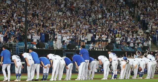 6월 12일 대구 삼성라이온즈파크에서 열린 프로야구 '2024 신한 SOL 뱅크 KBO리그' LG 트윈스와 삼성 라이온즈의 경기에서 5대 4 승리를 거둔 삼성 선수들이 홈 관중석 팬들을 향해 인사하고 있다. / 뉴스1