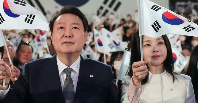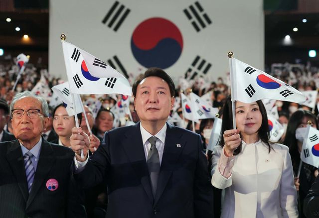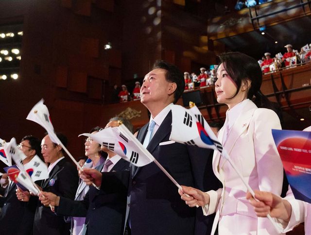 윤석열 대통령과 김건희 여사가 15일 서울 종로구 세종문화회관에서 열린 제79주년 광복절 경축식에서 태극기를 흔들고 있다. / 대통령실 제공