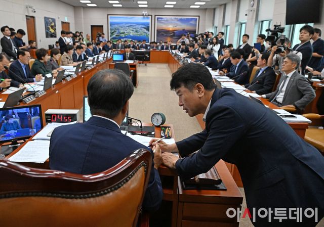 아시아투데이 송의주 기자 = 21일 국회에서 열린 국토교통위원회 전체회의에서 맹성규 위원장(왼쪽)과 야당 간사인 문진석 의원이 논의를 하고 있다. 이날 국토위는 여야 합의로 전세사기특별법 개정안을 처리했다.
