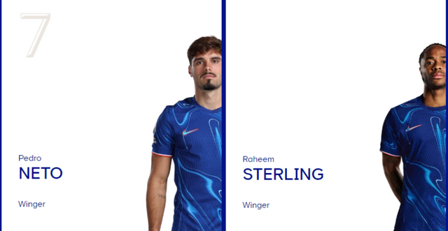 22일 첼시 공식 홈페이지에 게시된 소속 선수단 등번호. 네투가 스털링의 7번을 넘겨받았다. 훈련에서 제외된 스털링은 등번호를 배정받지 못했다. 사진=첼시 홈페이지