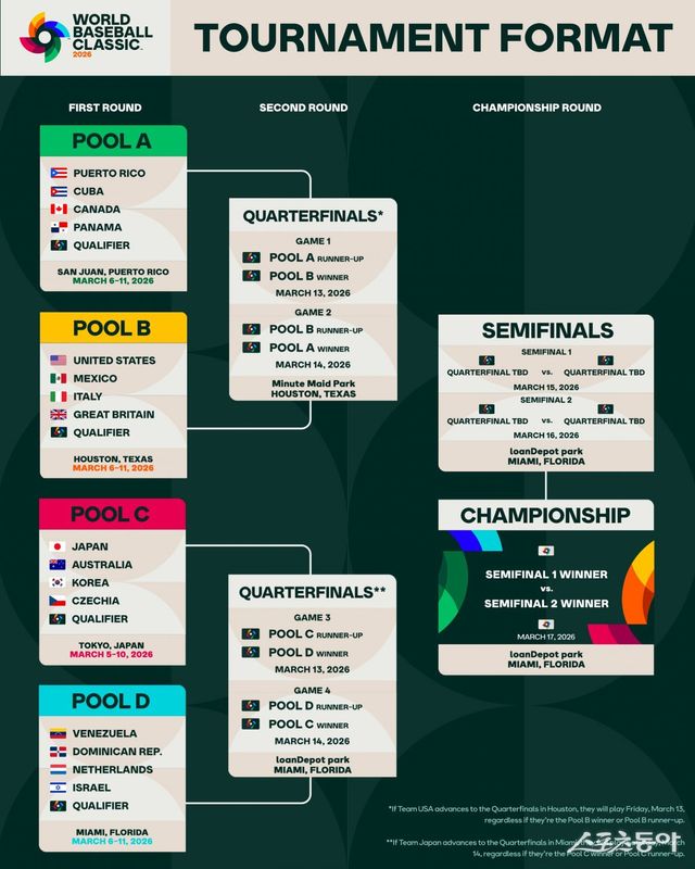MLB 사무국은 22일(한국시간) 2026년 개최될 제6회 WBC 일정과 조 편성을 공개했다. 총 20개국이 4개 조로 나눠 2026년 3월 5일 또는 6일부터 1라운드 조별리그를 펼친다. 한국은 C조에서 일본, 호주, 체코, 예선을 통과한 1팀 등 4팀과 경쟁한다. C조 경기는 3월 5일부터 10일까지 도쿄에서 벌어진다. 한국은 체코(5일), 일본(7일), 예선 통과팀(8일), 호주(9일)와 차례로 맞붙는다.