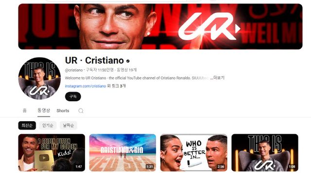21일(한국시간) ‘UR·Cristiano’라는 제목의 유튜브 채널을 개설했던 호날두는 24시간이 되기도 전에 구독자 수 1000만 명을 돌파했다. 22일 오전 11시 50분을 기준으로 구독자 수는 1150만 명이다.
