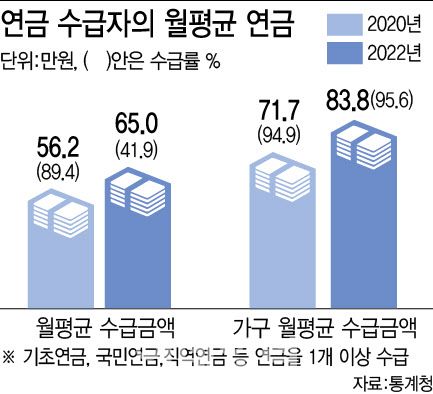 가구를 기준으로 보면 2022년 연금을 수령하는 65세 이상 1인 가구 중 연금 수급가구는 185만7000가구였다. 수급률은 94.1%이며, 중복 수급률도 41.1%에 달했다. 고령층 1인 가구는 월평균 58만원을 연금으로 받았다. 65세 이상 부부(2인) 가구의 경우 연금 수급자가 1명 이상 있는 가구는 190만6000가구로, 비율은 97.1%에 달해 1인 가구보다 높았다. 월평균 수급액은 115만6000원으로 나타났다.