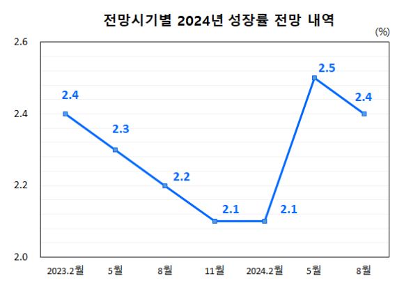 한은은 22일 올해 우리나라 경제성장률 전망치를 기존 2.50%에서 2.40%로 하향 조정했다. 2월에 비해 0.40%p나 올렸던 올해 5월 전망치와 큰 차이를 보이지는 않았다. 내년 경제성장 전망치도 기존 2.1%를 유지했다.