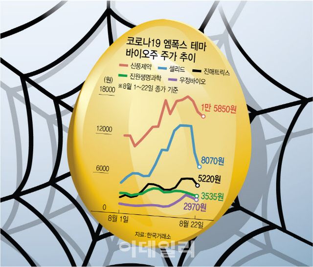 주가가 ‘이상 급변’하는 모습을 나타내자 투자자 피해를 우려한 거래소가 코로나19·엠폭스 테마주 주의보를 내렸다. 이달에만 관련 15개 종목에 내린 시장경보 조치가 33회에 이르고 21일에는 투자유의까지 발동했다.