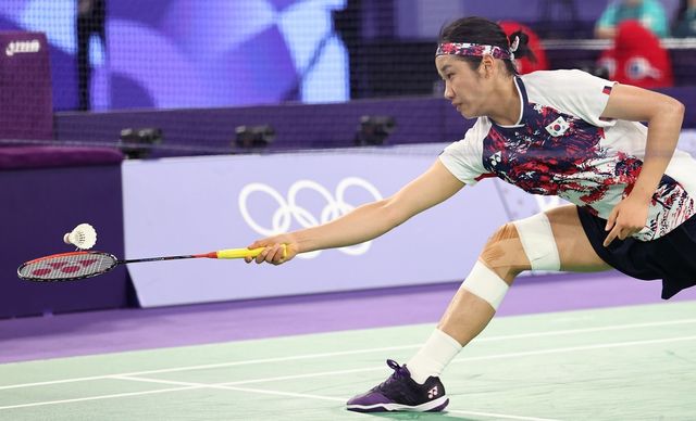 지난 5일(현지 시각) 프랑스 파리 포르트드 라 샤펠 아레나에서 열린 2024 파리올림픽 배드민턴 여자 단식 결승전에서 한국 안세영이 중국 허빙자오를 상대하고 있다. / 연합뉴스