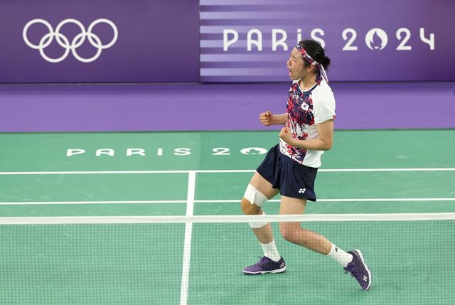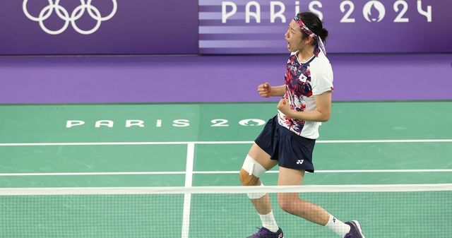 지난 5일(현지 시각) 프랑스 파리 포르트드 라 샤펠 아레나에서 열린 2024 파리올림픽 배드민턴 여자 단식 결승전에서 한국 안세영이 중국 허빙자오를 이기고 우승을 확정한 뒤 환호하고 있다. / 연합뉴스