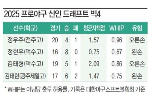 오른손 투수 정우주(전주고)와 왼손 투수 정현우(덕수고)가 '드래프트 톱2'라는 건 이견이 없다. 전체 1순위 지명권을 보유한 키움 히어로즈 선택에 따라 전체 2순위 한화 이글스가 남은 한 선수를 품을 것으로 전망된다. 흥미로운 건 그다음이다.