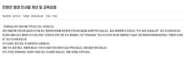 자신을 창원시에 사는 시민이라고 밝힌 글쓴이 A 씨는 민원 글을 통해 "이틀 전에 민원서류 발급차 인근에 있는 행정복지센터를 방문해 민원서류 발급을 요청한 적이 있다"며 "발급 담당분께 다가갔더니 '무슨 일로 오셨습니까'라고 인사하더라. 참 많이 당황스럽고 황당한 인사 아닌가"라고 주장했다.