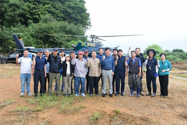 이날 현장에는 경작지 벼 재배농업인 및 지역농협 관계자 등 30여 명이 참석한 가운데 유인 헬기를 통한 친환경 공동방제 작업을 참관했다.