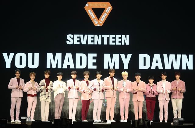 그룹 세븐틴이 2019년 1월 21일 서울 송파구 방이동 올림픽공원 올림픽홀에서 열린 6집 미니앨범 '유 메이드 마이 던'(YOU MADE MY DAWN) 발매 기념 쇼케이스에서 포즈를 취하고 있다. / 연합뉴스
