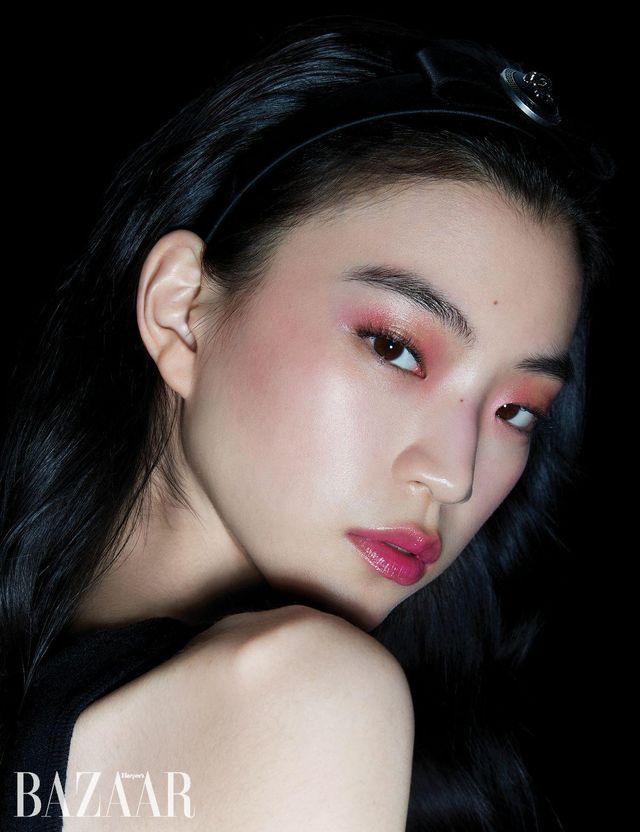 채도가 높은 핑크는 동양인 피부에 어울리기 쉽지 않으므로 색을 중화하는 전략을 선택할 것. 모델은 아이홀 중앙에 오팔 펄이 섞인 옐로 골드 하이라이터로 핑키한 느낌을 덜어내고 입체감을 부여했다. 밀착력을 높이기 위해 크림 섀도를 손가락으로 얇게 바르고 그 위에 파우더 섀도를 얹었다. 손가락에 남은 제형은 C존에 두드리듯 발라 컬러감이 눈과 연결되도록 했다. 입술에는 핑크 새틴 립스틱을 바르고 색이 없는 립밤을 얹어 촉촉하게 마무리했다.