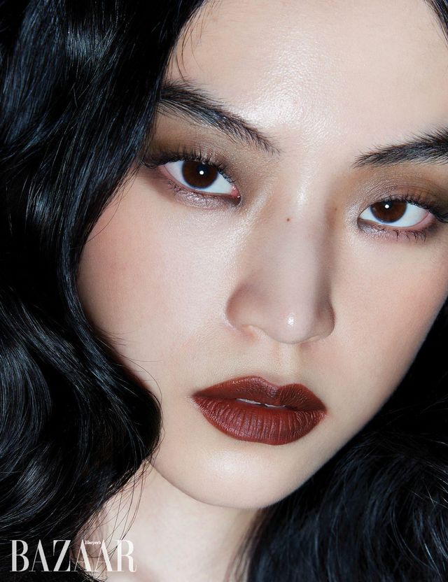 메이크업 아티스트 오미영은 컬러를 물들이듯 표현해 부드러운 느낌을 부각시켰다. “아이라이너는 생략하고 세 가지 컬러를 레이어링해 음영을 줬어요. 아이홀 전체에 카키, 중간 지점까지 그레이, 아이라인 가까이에는 브라운을 발랐죠. 말총 모양의 브러시에 섀도를 소량 묻혀 여러 번 블렌딩하는 것이 중요합니다.” 입술은 마호가니 컬러를 바르고 펄이 없는 짙은 브라운 섀도를 더해 채도를 낮추면서 매트한 효과를 극대화했다.