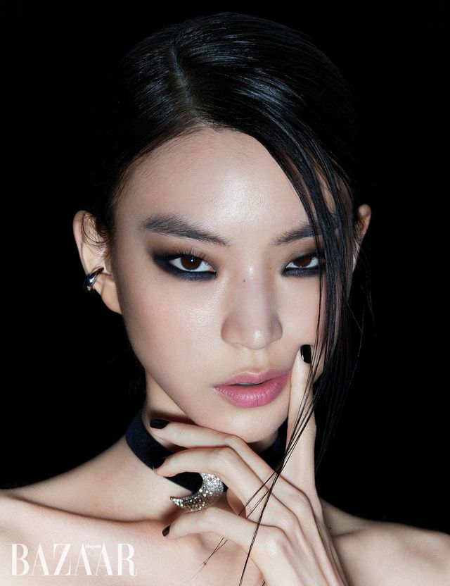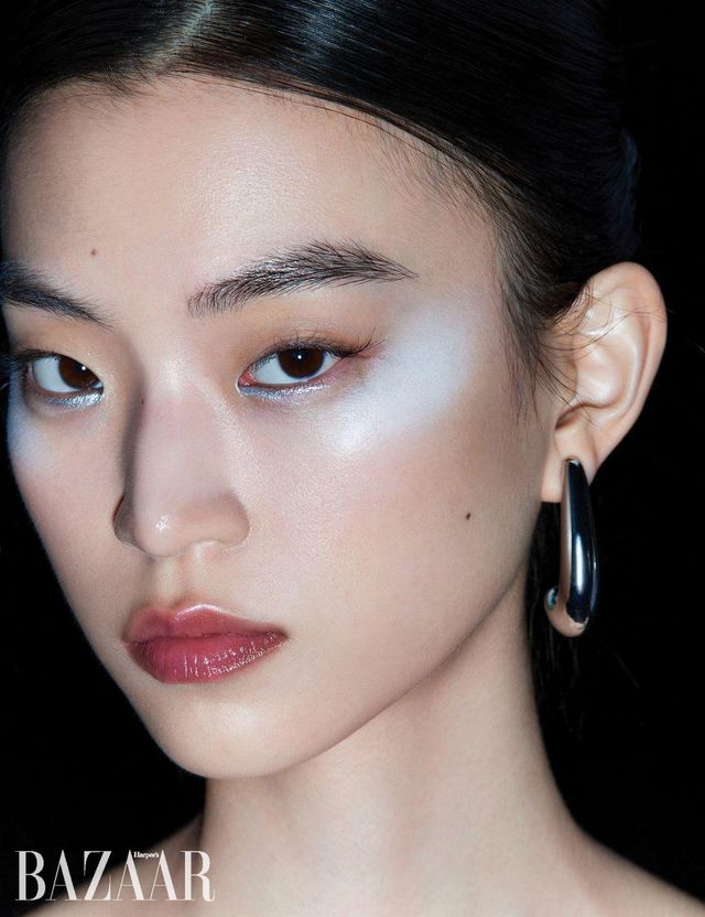 “실버 라이너를 눈머리부터 중간까지 발라 눈물 효과를 줬어요. 이때 점막을 채우면 눈이 작아 보이니 바깥쪽에 그려야 해요.” 메이크업 아티스트 오미영의 설명. 그 다음 신비로운 느낌을 한 스푼 더하기 위해 펄이 없는 크림 하이라이터를 광대뼈 위쪽 중앙에서 관자놀이까지 사선으로 칠했다. 단, 그러데이션으로 바르면 광대뼈가 넓어 보이니 주의할 것. 연결감을 주기 위해 라벤더 펄 섀도를 입술 산에 얹은 것은 메이크업 아티스트의 킥.