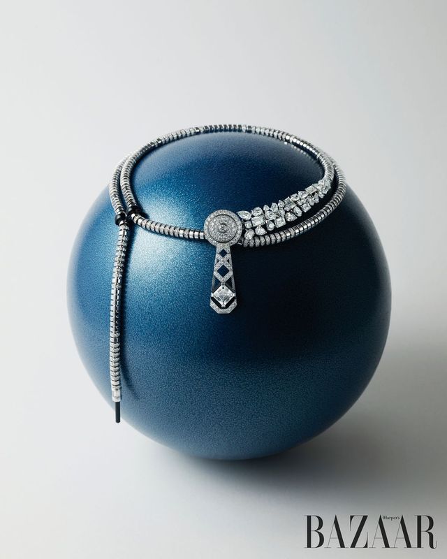 5.19캐럿 어셔 컷 다이아몬드 1개와 오닉스, 다이아몬드, 블랙 래커를 장식한 ‘골드 슬라이더’ 네크리스는 Chanel High Jewelry.